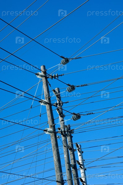 Сети линий электропередач против голубого неба