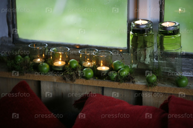Свечи и яблоки на подоконнике