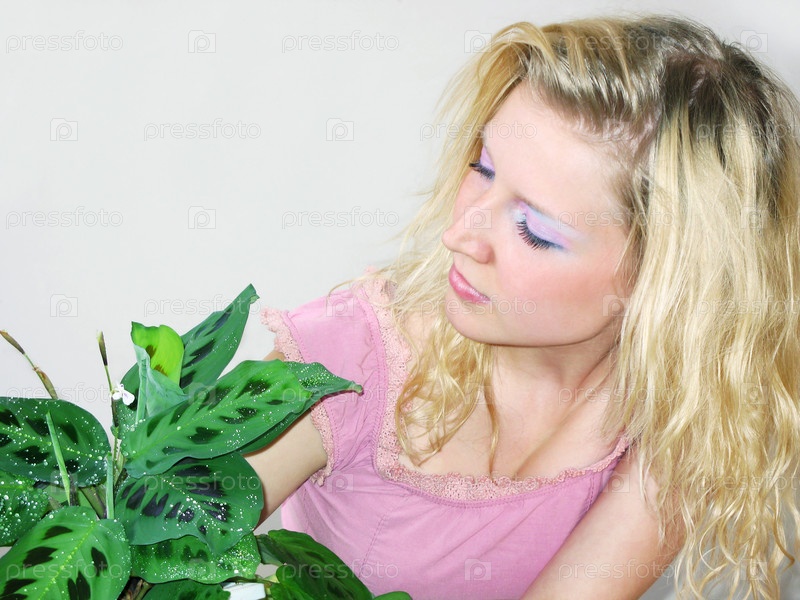 Светловолосая девушка с комнатным растением