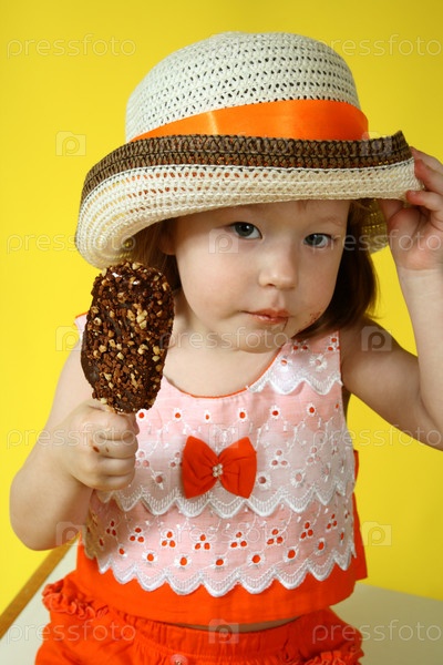 Маленькая девочка ест шоколадное мороженое с орехами