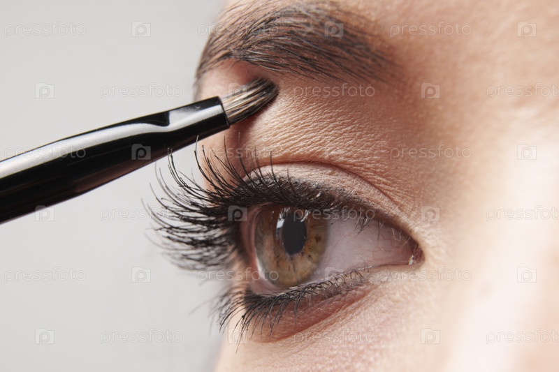 Женщина применения макияж глаз с кистью на белом фоне
