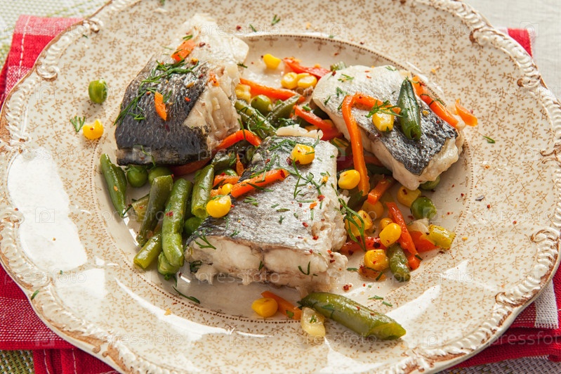 Рыба с овощами на красивой тарелкой