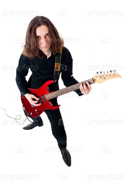 Молодой гитарист с красной гитарой на белом фоне