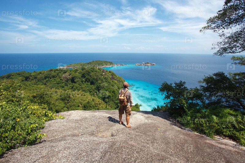 Путешественник с рюкзак стоя на скалах