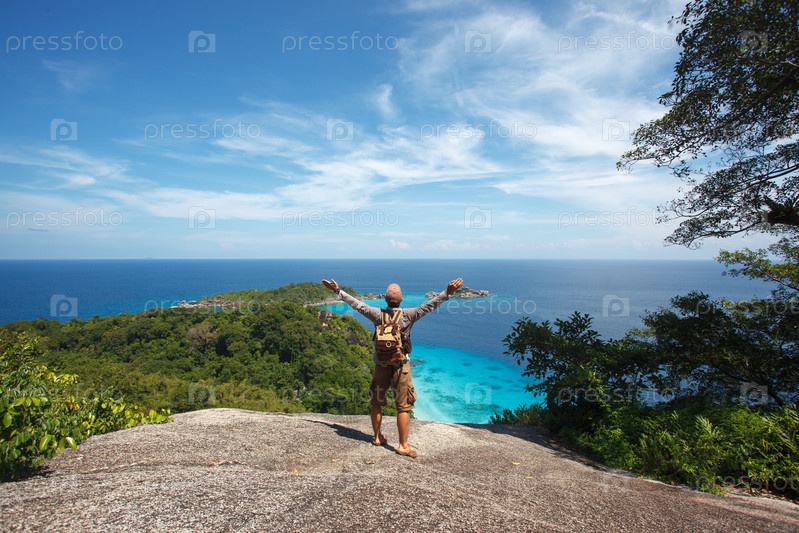 Путешественник с рюкзак стоя на скалах