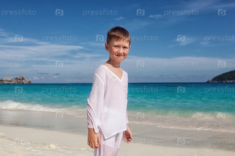 Портрет мальчика, стоя на тропическом пляже