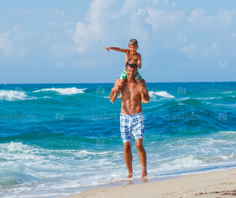 Отец и сын, играя в море