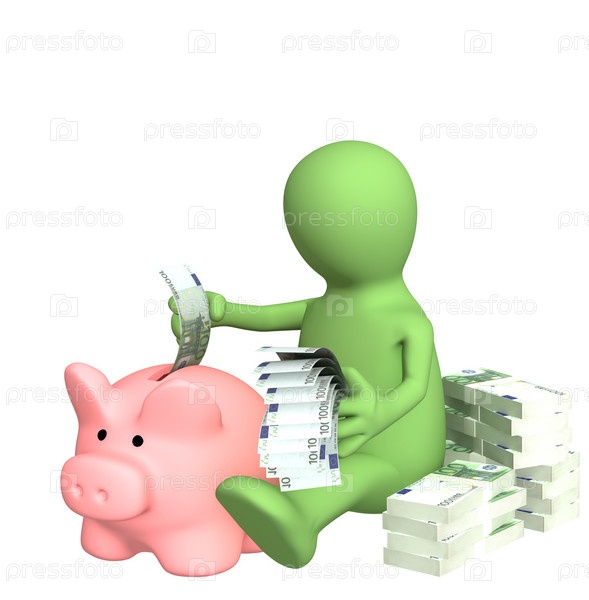 Маленький человек, бросающий деньги в свинью - накопитель