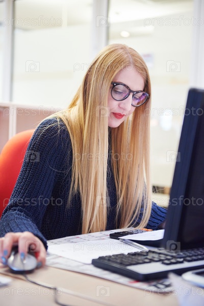 Женщина, работающая на компьютере в офисе