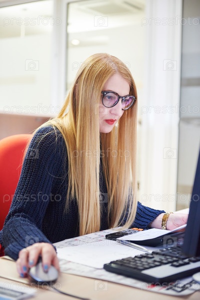 Женщина, работающая на компьютере в офисе