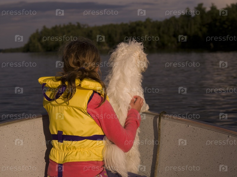 Девочка держит собаку в лодке