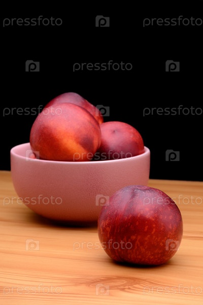 Спелый нектарины находятся в тарелку на столе на черном фоне