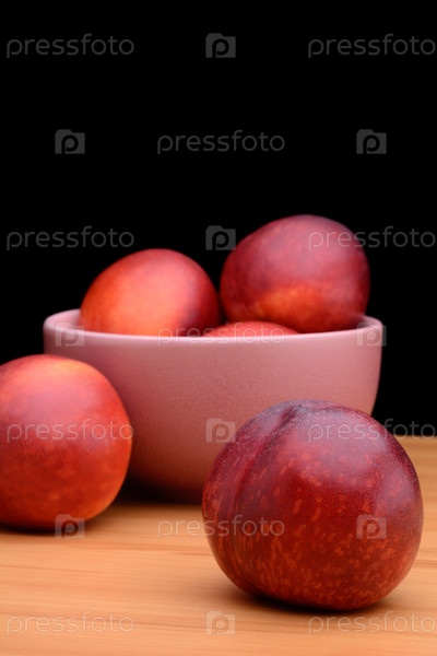 Спелый нектарины находятся в тарелку на столе на черном фоне