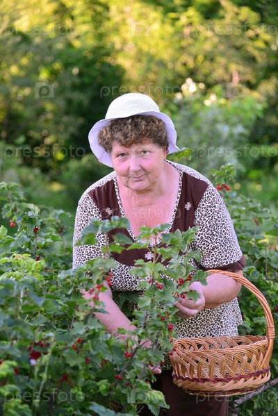 Пожилая женщина собирает урожай красной смородины в саду
