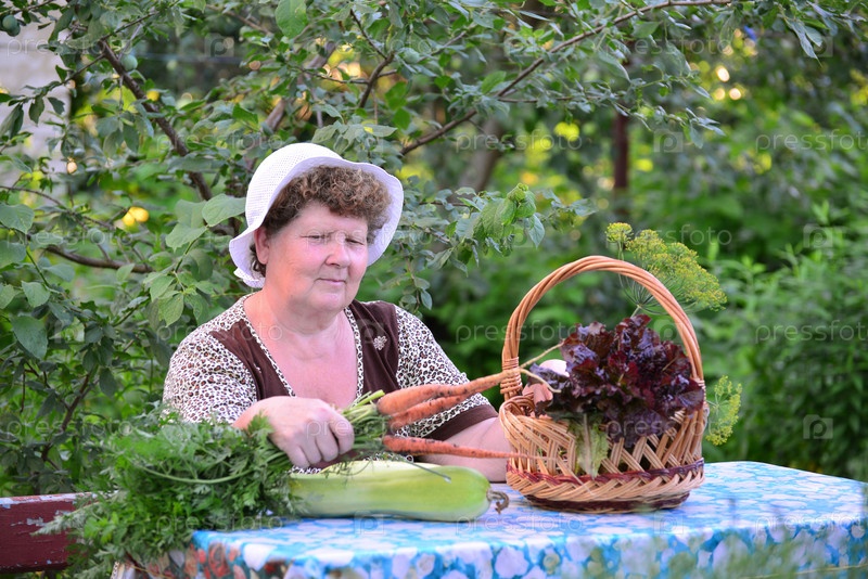Пожилая женщина с корзинойа овощей, сидя за столом