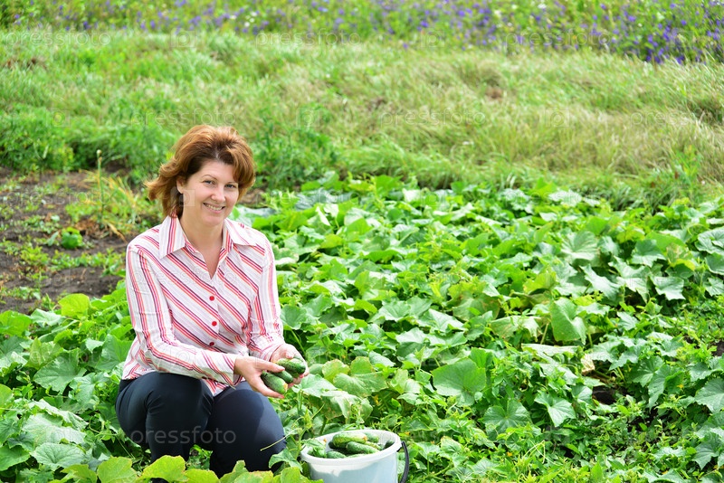 Женщина урожай огурцов на даче