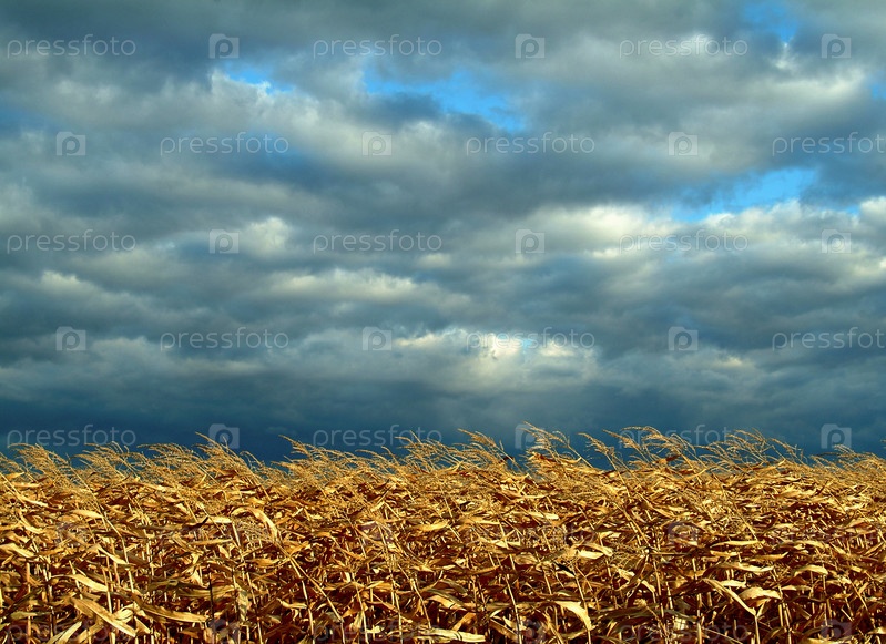 Сухое кукурузное поле под серыми тучами