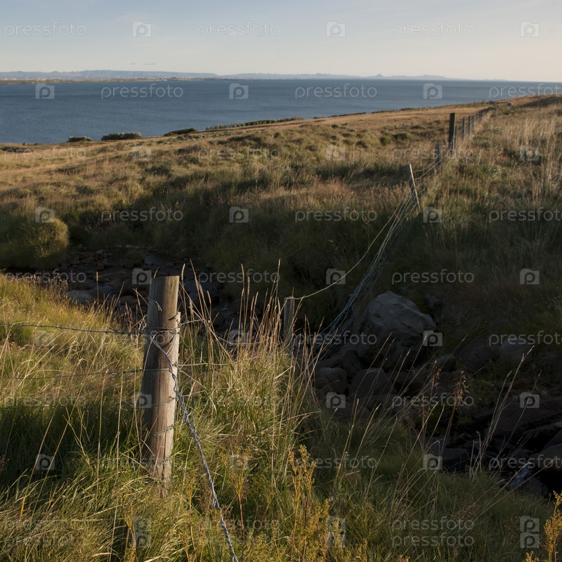 Пейзаж, пастбищ вдоль береговой линии, с проволокой и овраг