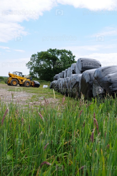 Тюков сена, завернутый в черный пластик, перемещаемые фермер