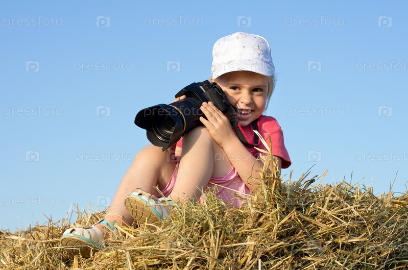 Маленькая довольная девочка с зеркальным фотоаппаратом на свежем воздухе