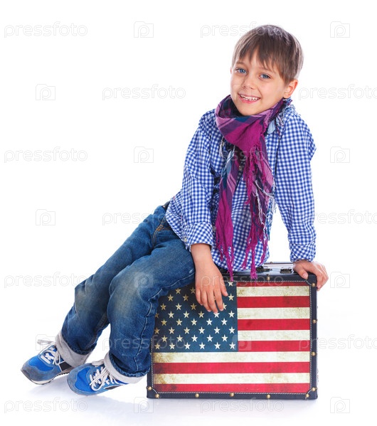 Мальчик сидит на чемодане