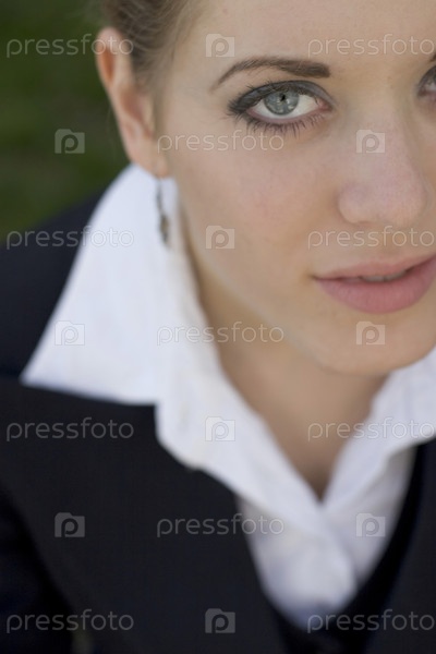 Бизнес женщина сидит в ее бизнес одежду, смотрит на камеру с акцентом на один глаз
