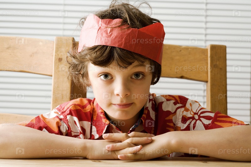 Портрет мальчика, сидя на стуле в короне бумаги