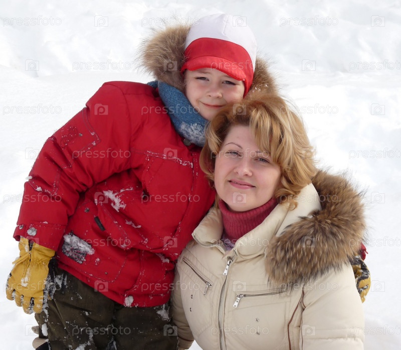 Счастливые мать и сын зимой