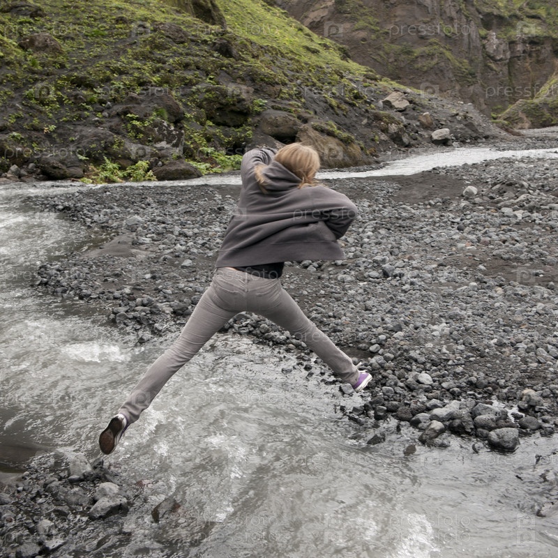 Девушка прыгает через реку