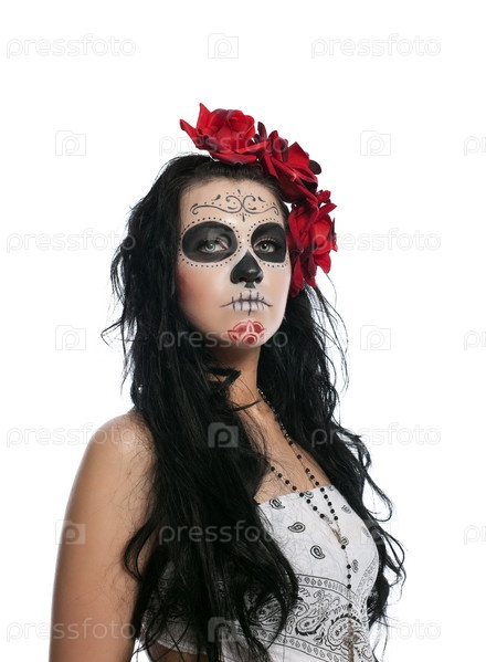 Брюнетка с нарисованным черепом на лице и красными цветами в волосах, студийный портрет