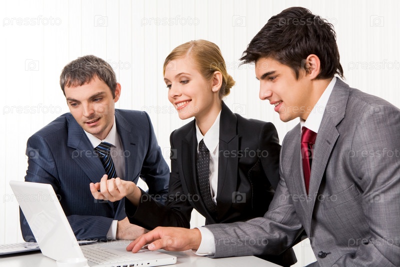 Портрет руководителей, смотрящих на монитор ноутбука и обсуждающих новый проект во время совещания