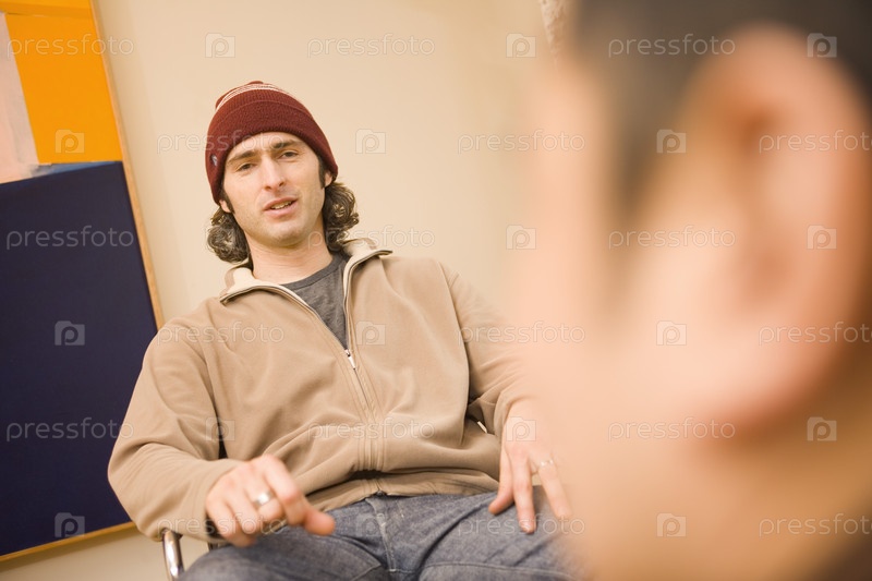 Молодые люди сидя на стуле
