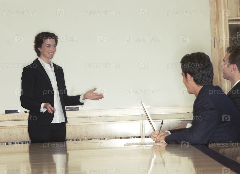 Деловая женщина давая представление в Совет номер с ее руки появиться