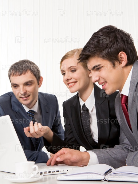 Портрет руководителей, планирующих работу и смотрящих на монитор ноутбука во время совещания