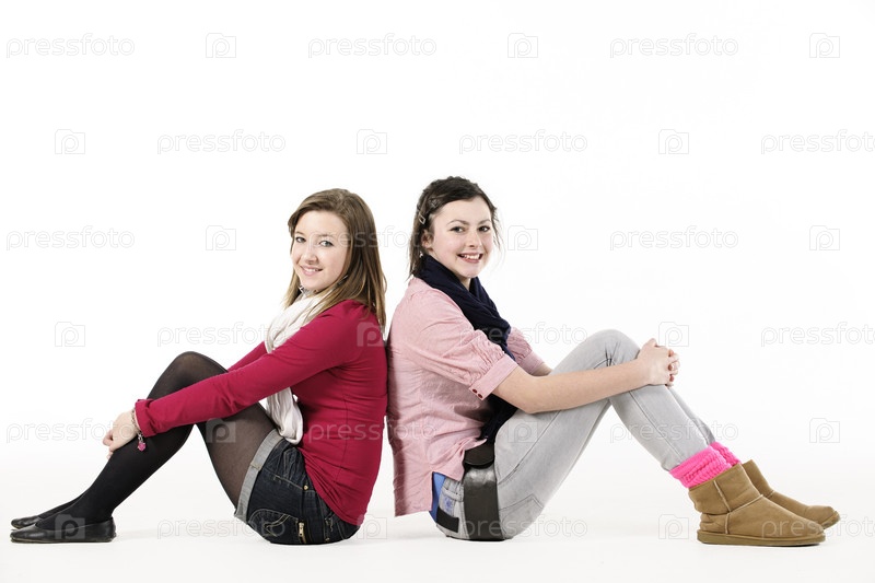 Девочек-подростков, сидя спиной к спине на белом фоне