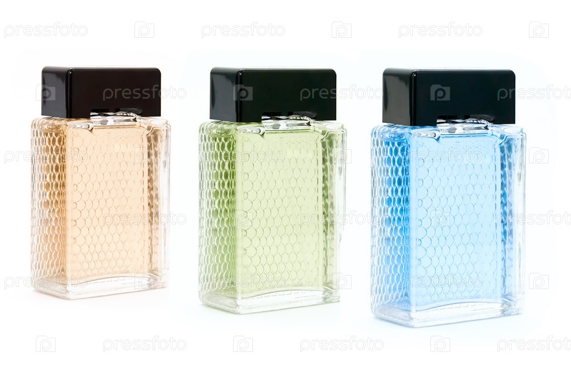 Три флакона духов на белом фоне