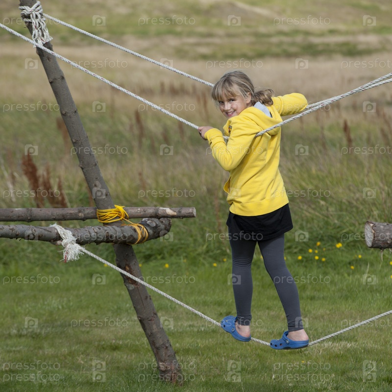 Девушка, балансируя на веревке