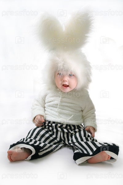 Маленький мальчик в костюме кролика на белом фоне