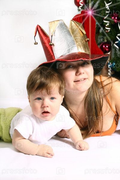 Маленький мальчик с сестрой в колпаке на фоне новогодней елки