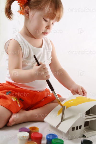 Маленькая девочка раскрашивает макет дома