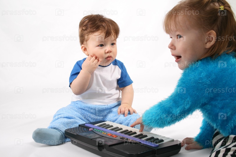 Маленький мальчик и девочка играют на синтезаторе