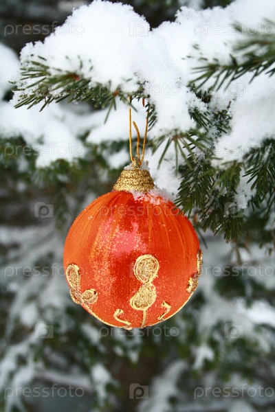 Оранжевый новогодний шар на ветке в снегу