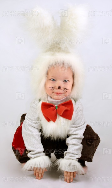 Маленькая девочка в костюме зайчика на белом фоне