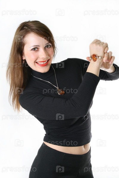 Портрет молодой девушки на белом фоне, которая показывает браслет