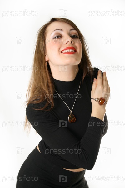 Молодая девушка на белом фоне, которая показывает браслет