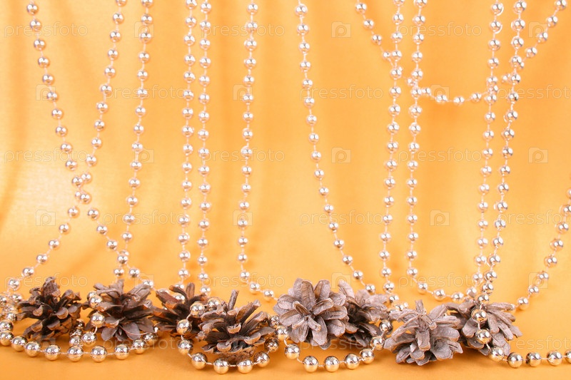 Рождественский фон: бусы и сосновые шишки