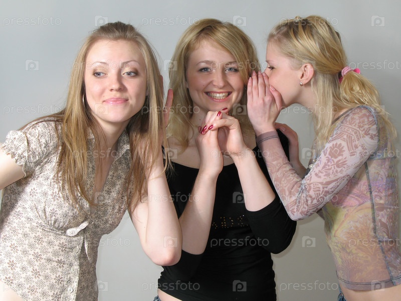 Две молодые девушки разговаривают между собой, а третья подслушивает