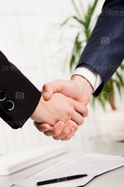 Фото рукопожатия деловых партнеров после заключения сделки на фоне подписанных документов