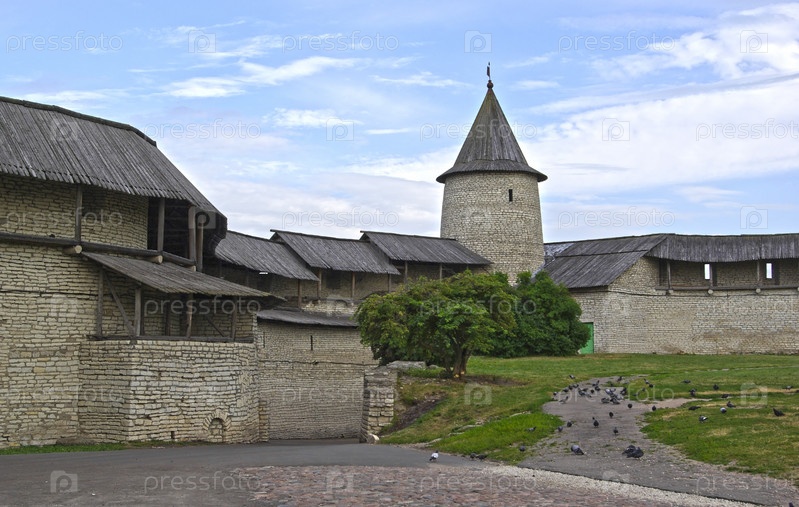 Панорамный вид на башни и городские стены Псковского Кремля