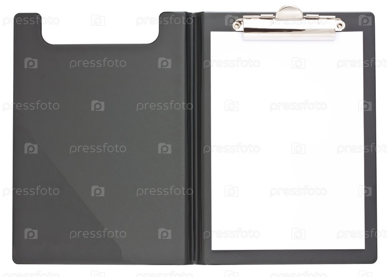 Черный планшет и лист бумаги на белом фоне